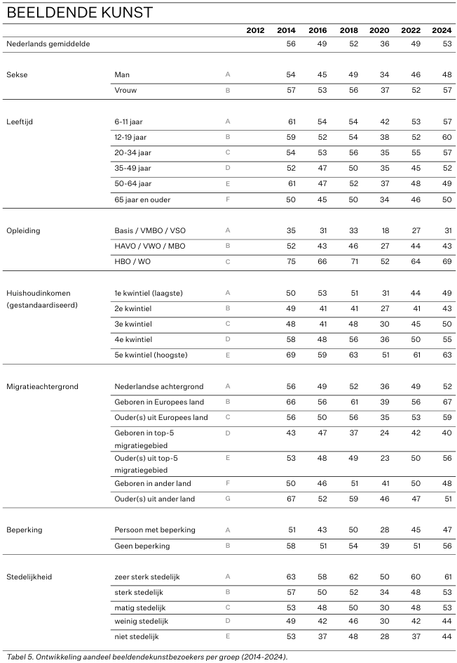 In 2024 bezocht 53 procent van de Nederlanders ten minste één locatie met beeldende kunst, zoals een museum voor kunst of vormgeving, een tentoonstelling, atelier, galerie, expositieruimte of kunst in een openbare ruimte. Ook bij dit bezoek zijn er verschillen te zien tussen bevolkingsgroepen.