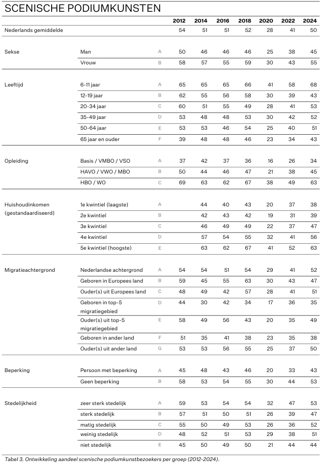 Een groot verschil doet zich voor naar opleidingsniveau; van de Nederlanders met een hbo- of wo-opleiding bezocht 63 procent in 2024 een scenische podiumkunstvoorstelling, tegenover 45 procent van de havo/vwo/mbo-opgeleiden en slechts 34 procent van de basis/vmbo/vso-opgeleiden. De kloof tussen opleidingsniveaus is hiermee niet kleiner geworden over de jaren.